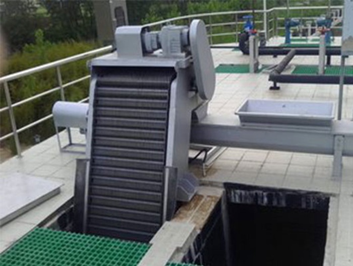 该设备采用链板回转式,由固定栅条组成过水栅面,当污水流过时,大于栅隙的杂物被拦截,耙齿板的耙齿深入栅条的间隙中,当驱动装置带动牵引链作回转运动时,耙齿把截留在栅面上的杂物自下而上带至出渣口,杂物依靠重力自行脱落,从卸料口中落下输送机或垃圾小车内,然后外运或作进-步的处理。